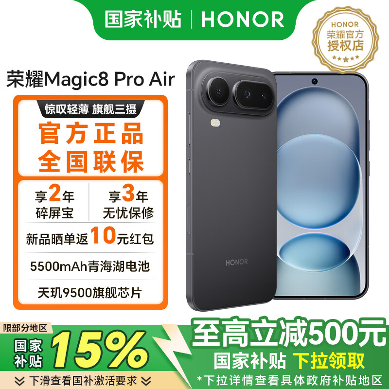 荣耀Magic8 Pro Air 新品5G手机 轻至155g 薄至6.1mm 小至6.31英寸 全焦段闪光人像 AI手机 国家补贴 影黑 12GB+256GB【2年碎屏险+3年质保】 官方标配【12期免息】