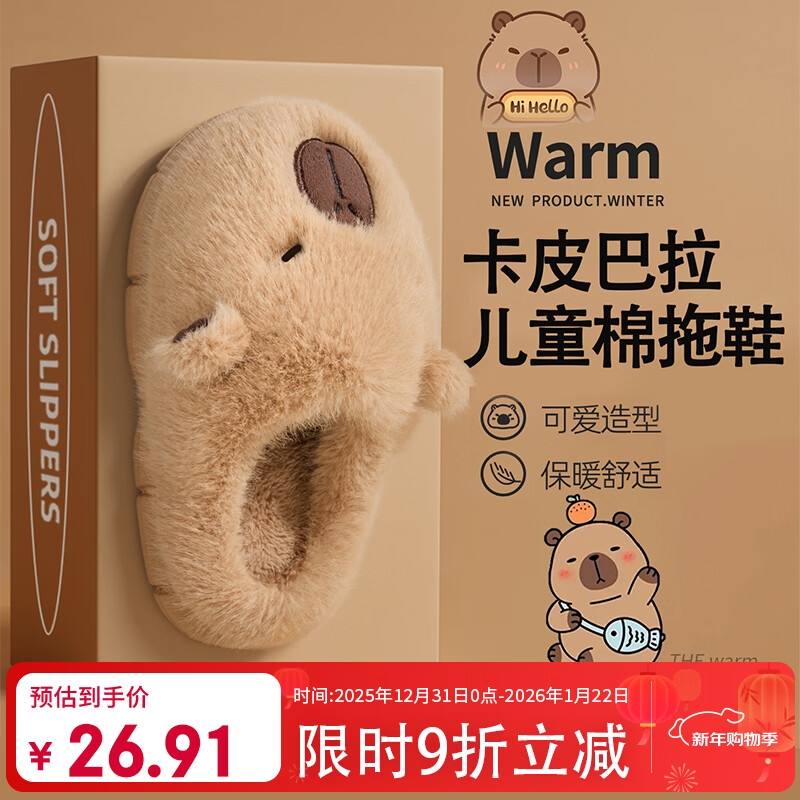 利达妮(TZLDN)卡皮巴拉儿童棉拖鞋女童6-12岁冬季室内家用保暖加绒可爱拖鞋男孩