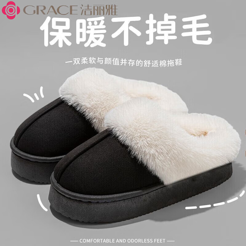 洁丽雅(grace)棉拖鞋男女秋冬季室内外穿情侣居家保暖加绒外穿防臭防滑棉拖 女款A+升级款【加绒加厚黑色】 40-41 (270mm) 【适合39-40】