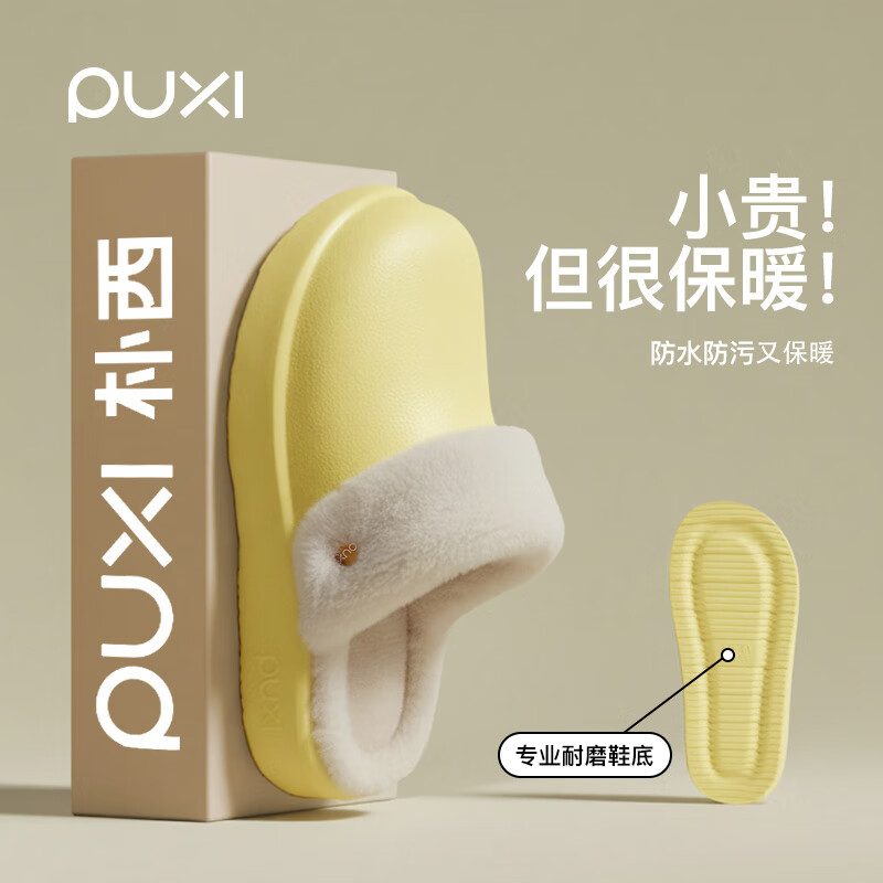 朴西踩屎感棉拖鞋女款防水冬季室内居家加绒保暖静音简约情侣棉拖鞋男 香蕉黄 【穿上增高显白】 38-39 适合(37-38)