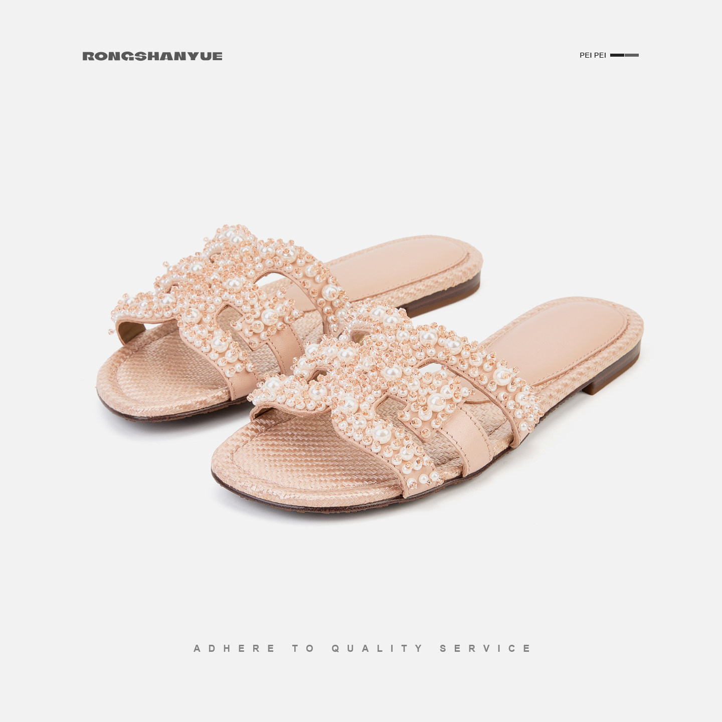 Rongshanyue仙女风一字拖鞋女26新款平底拖鞋珍珠沙滩凉拖B1614