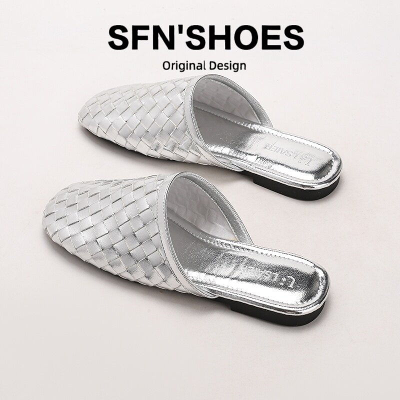 2026新款编织包头拖鞋女夏季外穿透气平底休闲银色穆勒鞋真皮凉拖