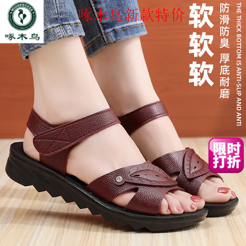 啄木鸟凉鞋女夏季2025新款外穿厚底软底防滑妈妈中老年人凉拖鞋女鞋 酒红色 【防滑柔软】 37