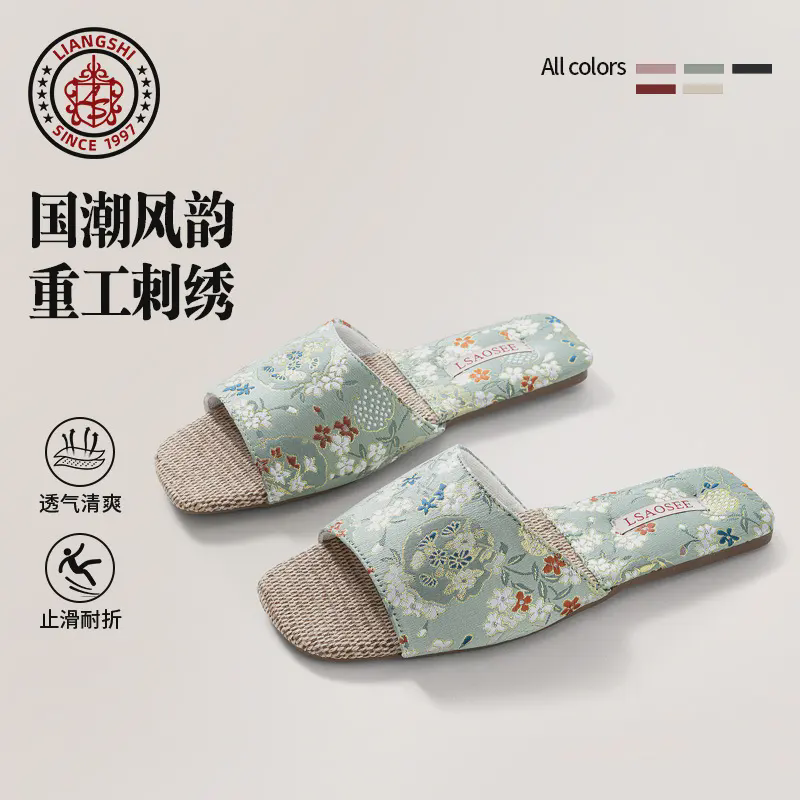 新中式亚缎面麻刺绣牛筋底居家凉拖鞋国潮风春夏季开口女士一字拖