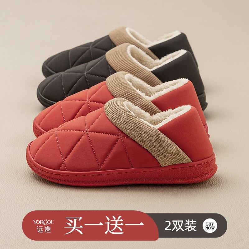 2双装 带跟棉拖鞋女秋冬季家居室内加绒保暖外穿防滑全包跟棉鞋男