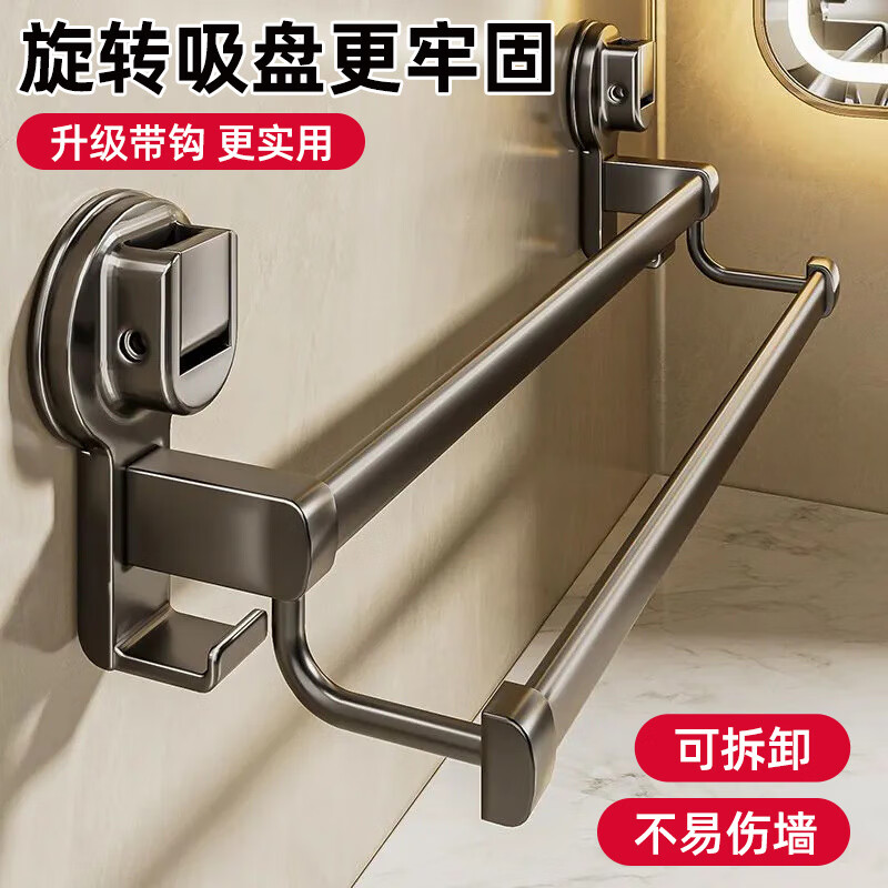 优勤吸盘毛巾架卫生间免打孔浴室毛巾拖鞋收纳壁挂架洗手间双杆置物架 【枪灰-50cm】双挂杆 强力吸附