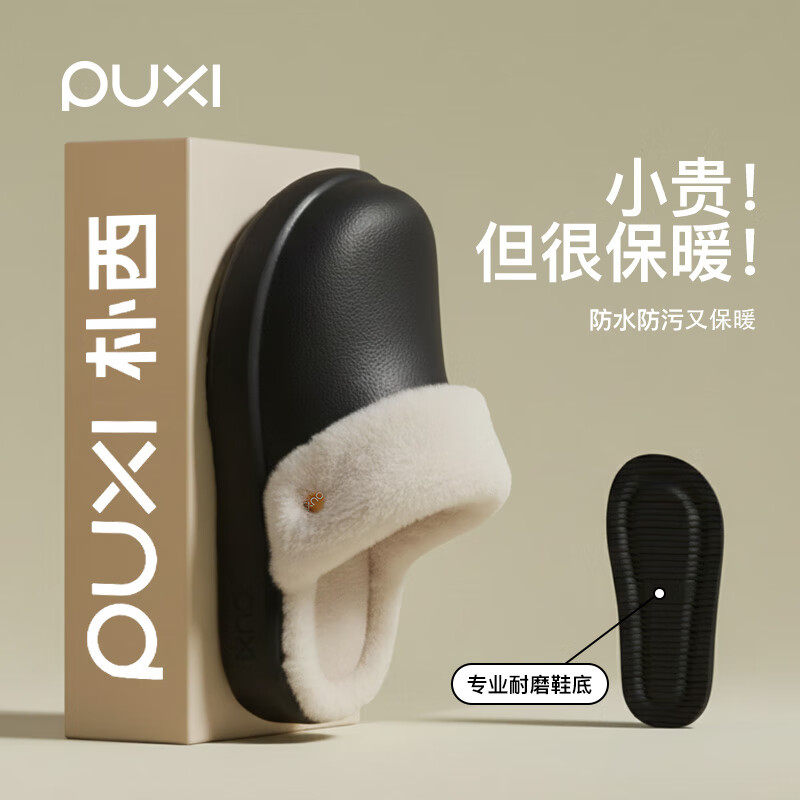 朴西女士防水棉拖鞋秋冬季居家室内保暖可拆卸毛绒厚底增高男士拖鞋 黑色 36-37