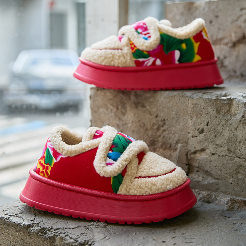 女士冬季棉拖鞋魔术贴东北大花民族风防滑加绒保暖外穿