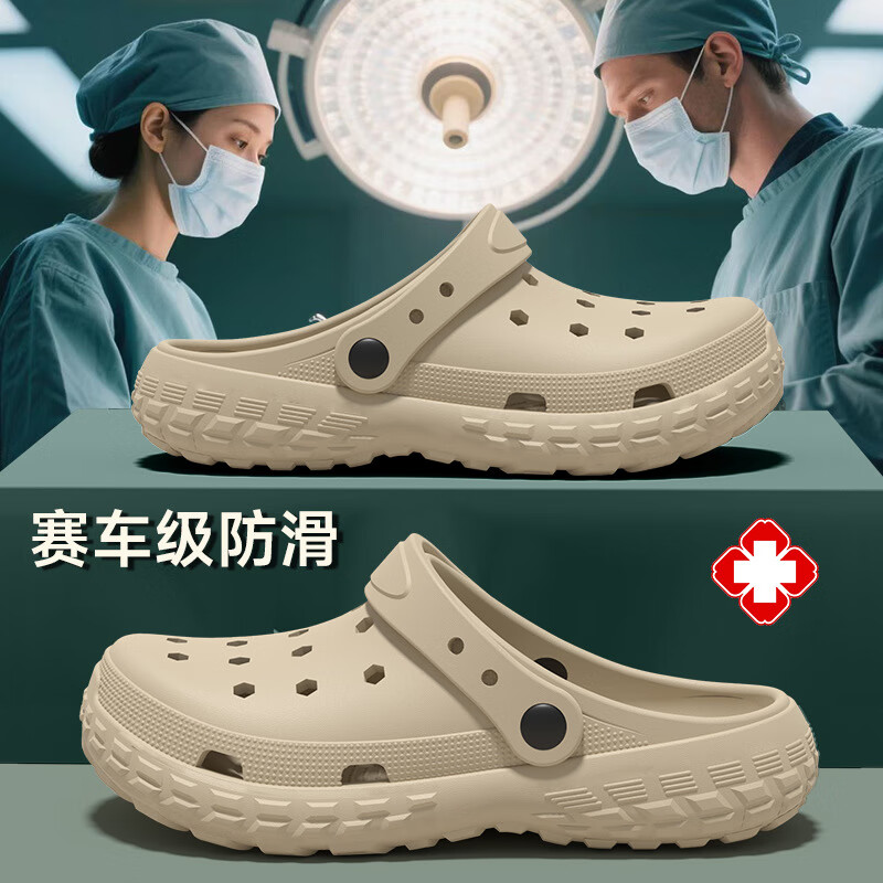 FOURDATRY手术室洞洞鞋男款护士专用2025新款夏季外穿防滑防臭EVA凉拖鞋男 卡其-赛车级防滑 手术室专用鞋, 38 -39