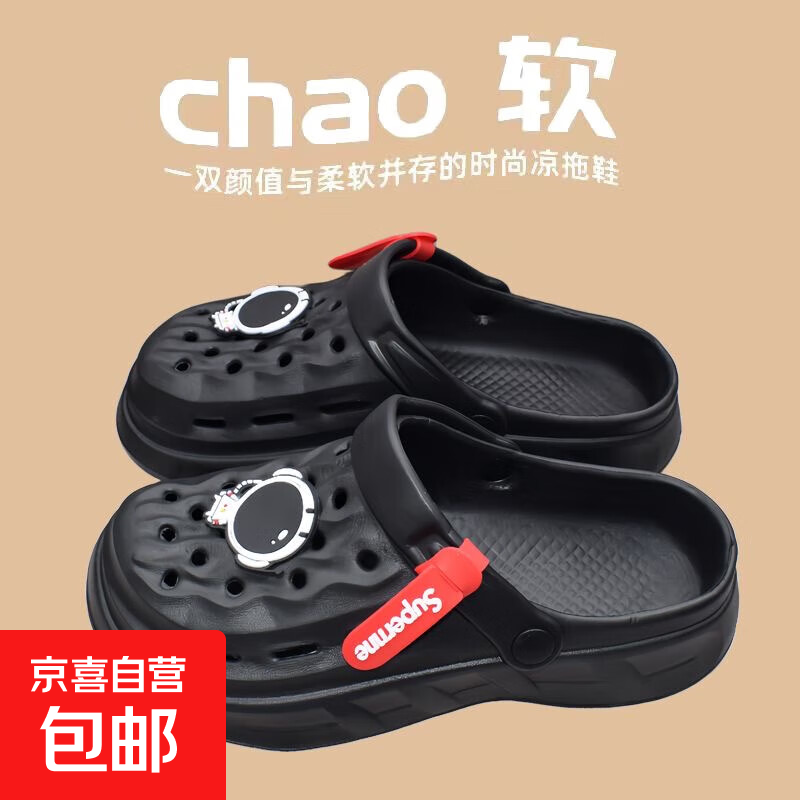 宇航员外穿洞洞鞋男士一字拖男沙滩鞋男居家拖鞋男凉鞋凉拖鞋女包 黑色 42-43