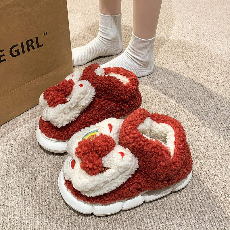 贺新款高包跟醒狮棉拖鞋女士冬室内家居加绒厚底防滑情侣新年棉鞋