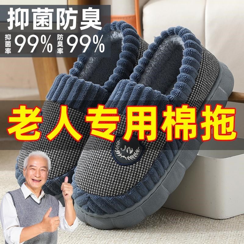 新款棉拖鞋防滑老人踩屎感棉男士冬季家居家用加绒厚底保暖带跟鞋