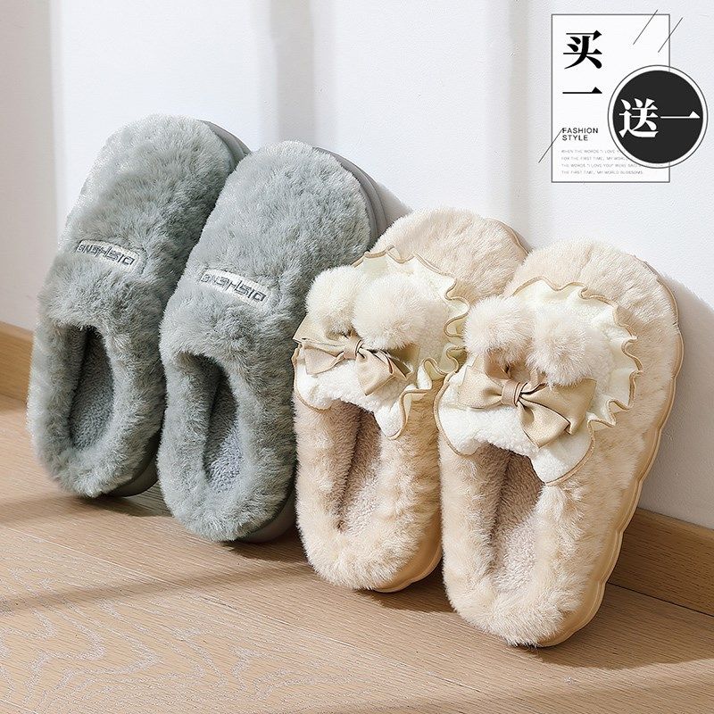 买1送1棉拖鞋女士冬季2024新款室内家居情侣一对毛绒保暖厚底拖鞋