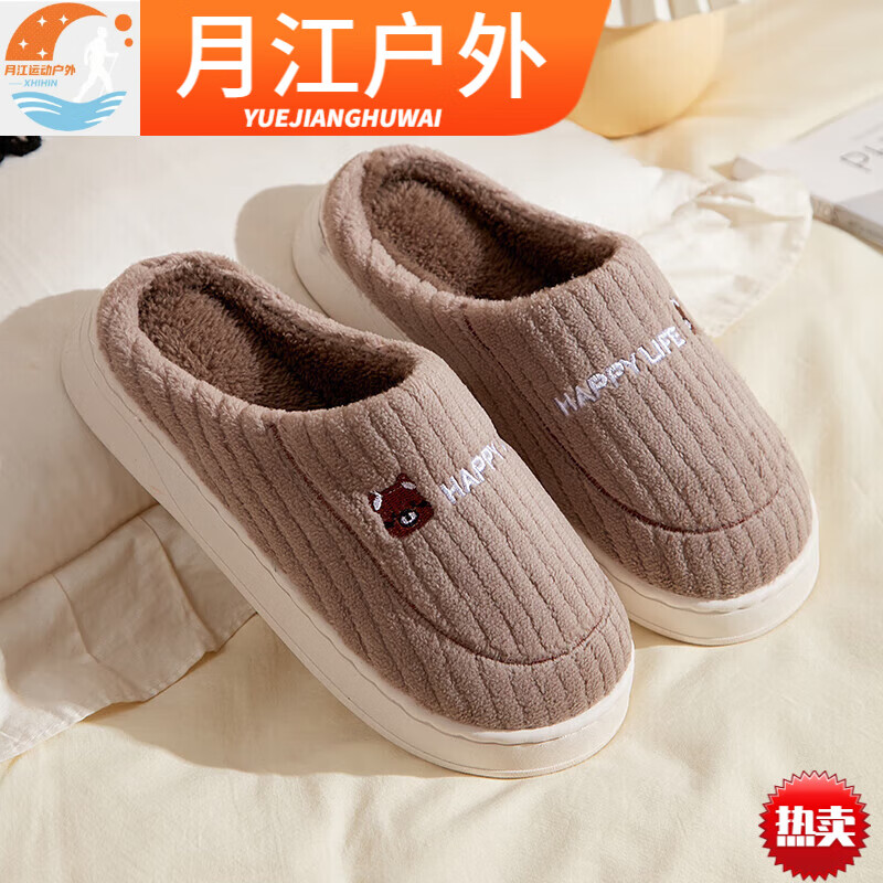 红豆小熊防水棉拖鞋女款冬季2025新款防滑厚底防臭保暖踩屎感毛拖鞋女 杏色印花小熊【加绒加厚】 37-38 标准码