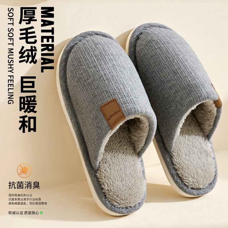 奥康(Aokang)棉拖鞋男士秋冬季室内居家保暖防滑抗菌不臭脚加绒加厚高端拖鞋女 灰色 40-41 【适合39-40】