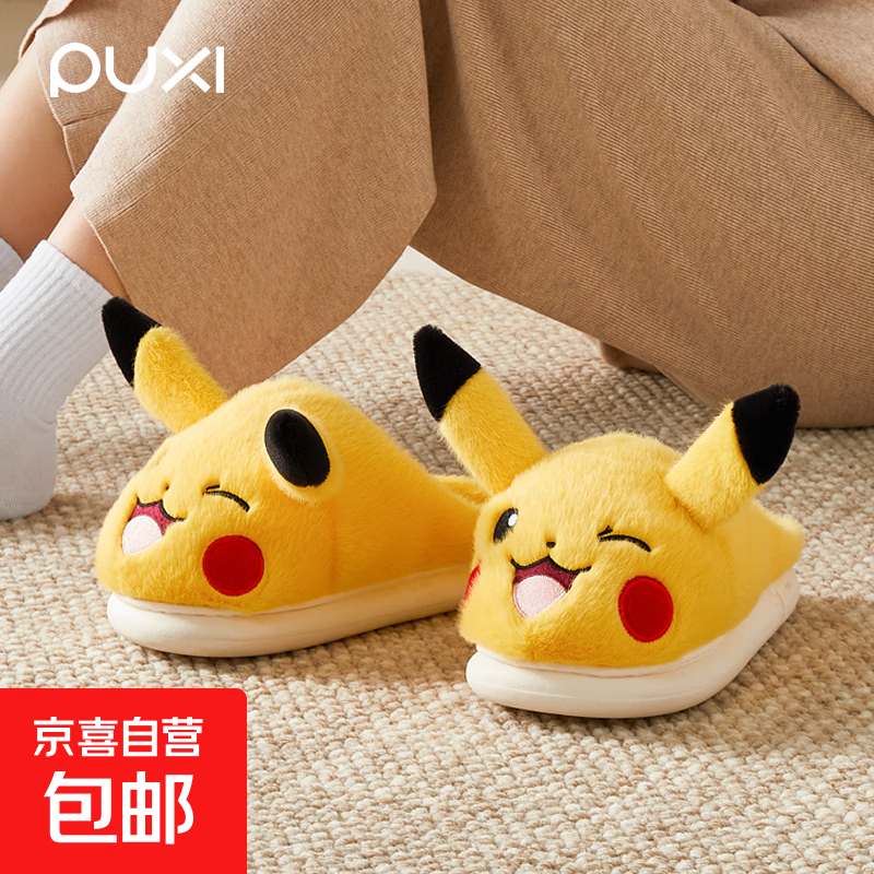 朴西冬季室内皮卡丘棉拖鞋萌趣可爱范珊瑚绒毛儿童防滑毛绒棉拖鞋 皮卡丘黄 32-33
