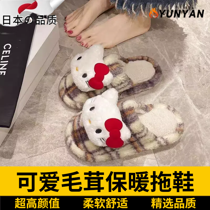 日本条纹格子kt猫棉拖秋冬保暖休闲鞋懒人居家舒适毛毛拖鞋防滑耐