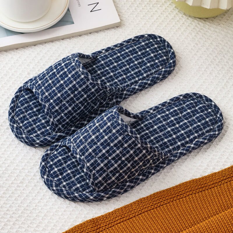 韵优利(yunyouli)格子可机洗家居棉布艺拖鞋男女情侣家居木地板静音无声软布底 清新格男深蓝 42-43 男款大码适合脚