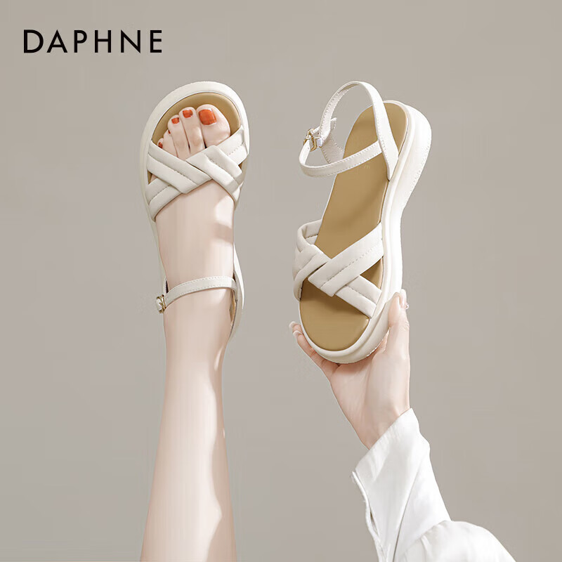 达芙妮七夕礼物凉鞋女夏季一字带沙滩凉鞋平底凉拖鞋女凉鞋 米白色 37