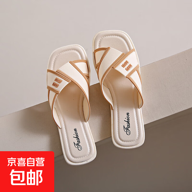 时尚拖鞋女士2026夏季外穿防滑沙滩鞋新款平底交叉一字休闲凉拖鞋 白色 36-37