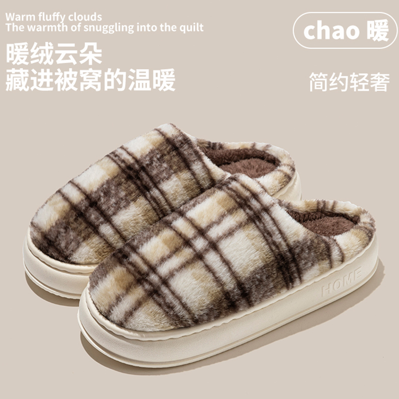 秋冬季棉拖鞋女保暖室内家用防滑厚底时尚K格子居家男毛绒情侣地