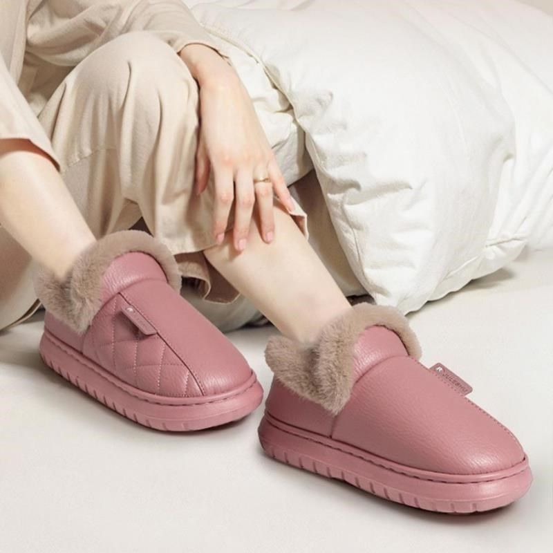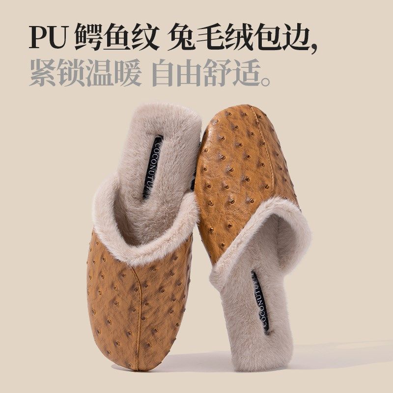 秋冬季温柔气质毛口高级感防水PU皮棉拖鞋女牛筋底室内防滑保暖男