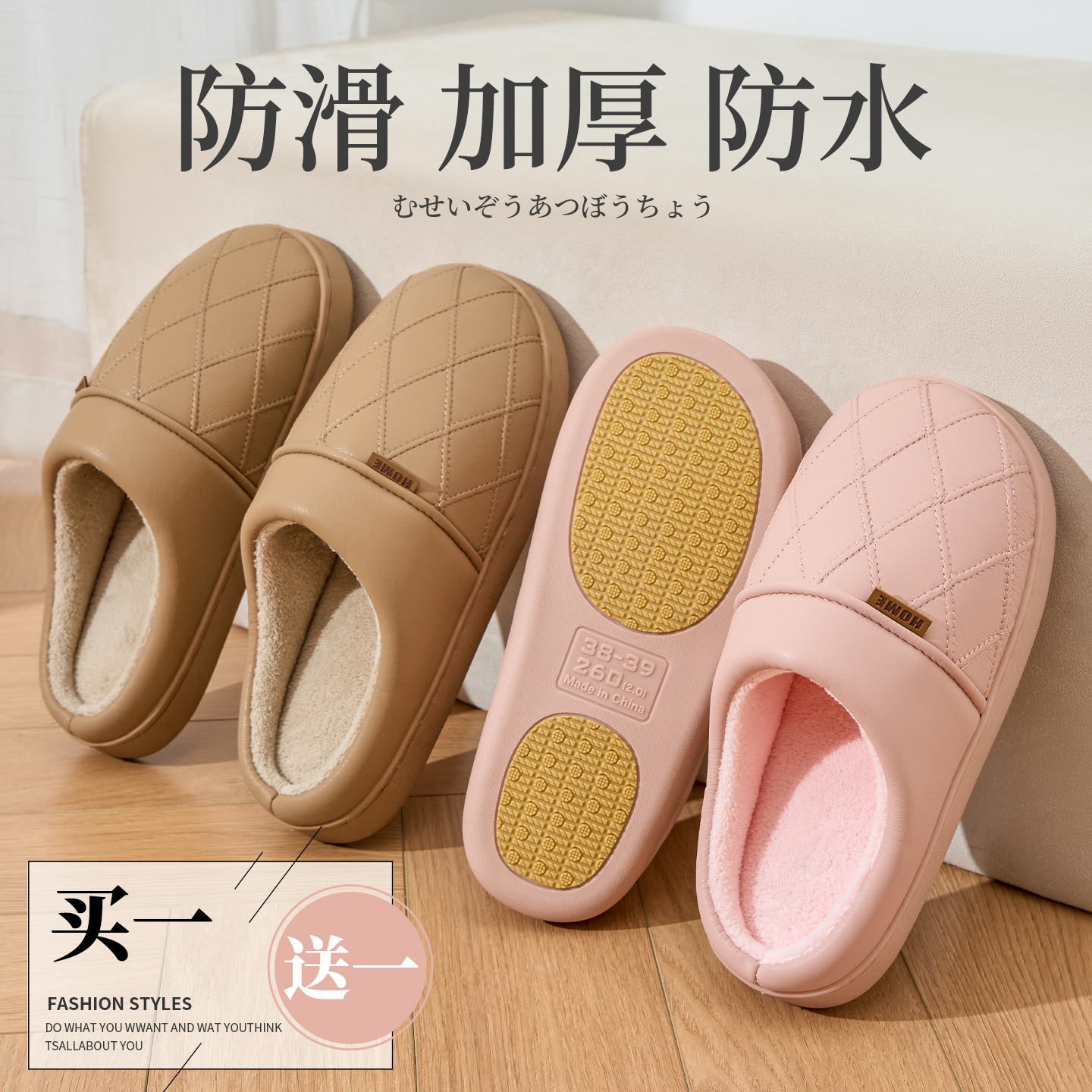 买一送一防水棉拖鞋女秋冬季2025新款家居保暖防滑抗菌皮面棉拖男