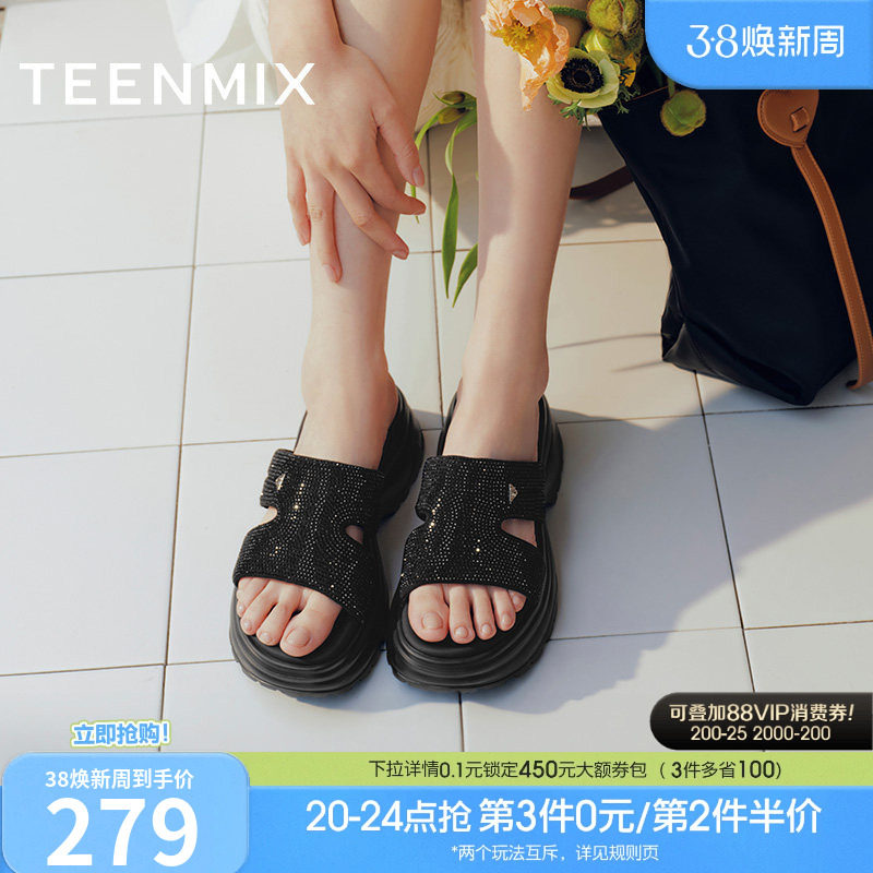 天美意一字拖闪钻增高厚底拖鞋女外穿休闲凉拖夏季新款BI972BT5