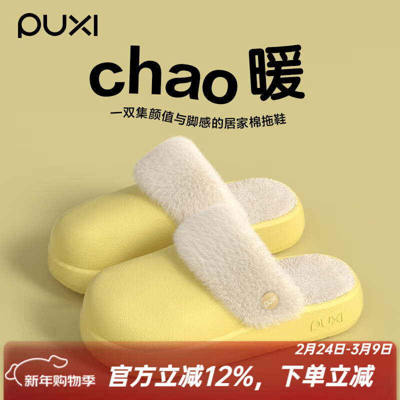朴西防水棉拖鞋女冬季室内家居厚底防滑保暖可拆洗棉绒棉拖鞋情侣款 香蕉黄 36-37
