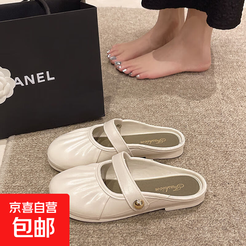 软底懒人包头拖鞋褶皱2026女外休闲新款一脚蹬平底法式外穿拖鞋女 白色 36-37 适合35-36脚