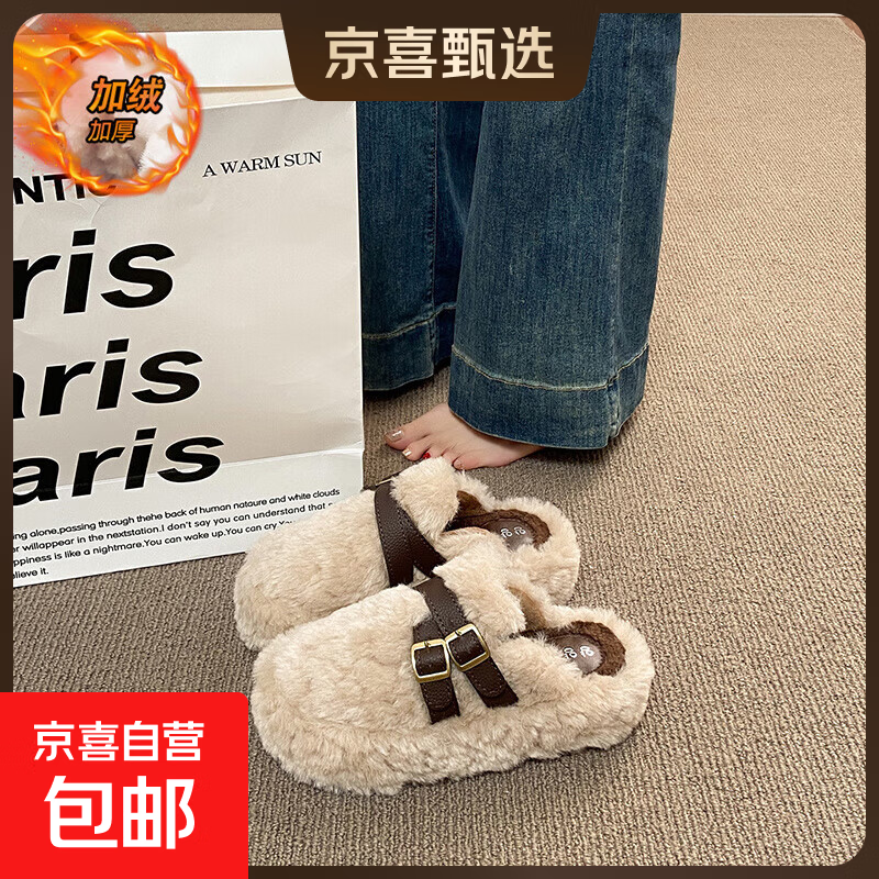 厚底包头毛毛拖鞋女2025新款冬季外穿一脚蹬配裙子百搭加绒棉拖鞋 TXNX-6800米色 37