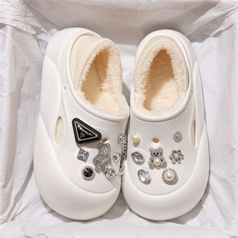 今年流行爆款拖鞋洞洞鞋女加绒加厚外穿冬厚底增高包头保暖棉拖鞋