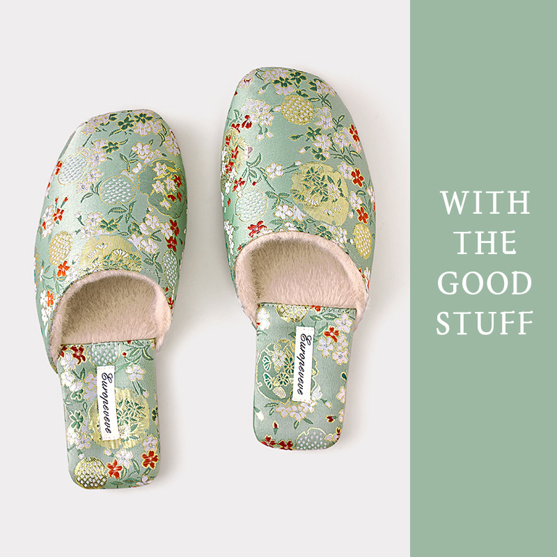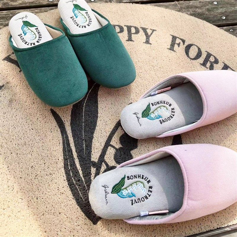 三色堇铃兰。日系绣花春秋地板软底家用棉拖鞋包头月子鞋静音女士