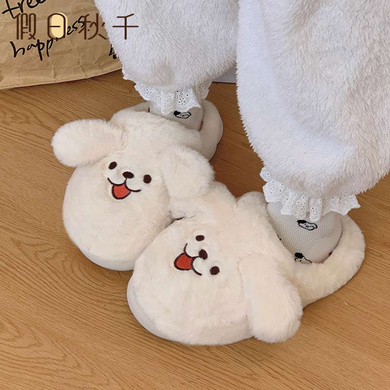 线条小狗棉拖鞋女秋冬季男女情侣新款外穿居家防滑保暖月子鞋假日