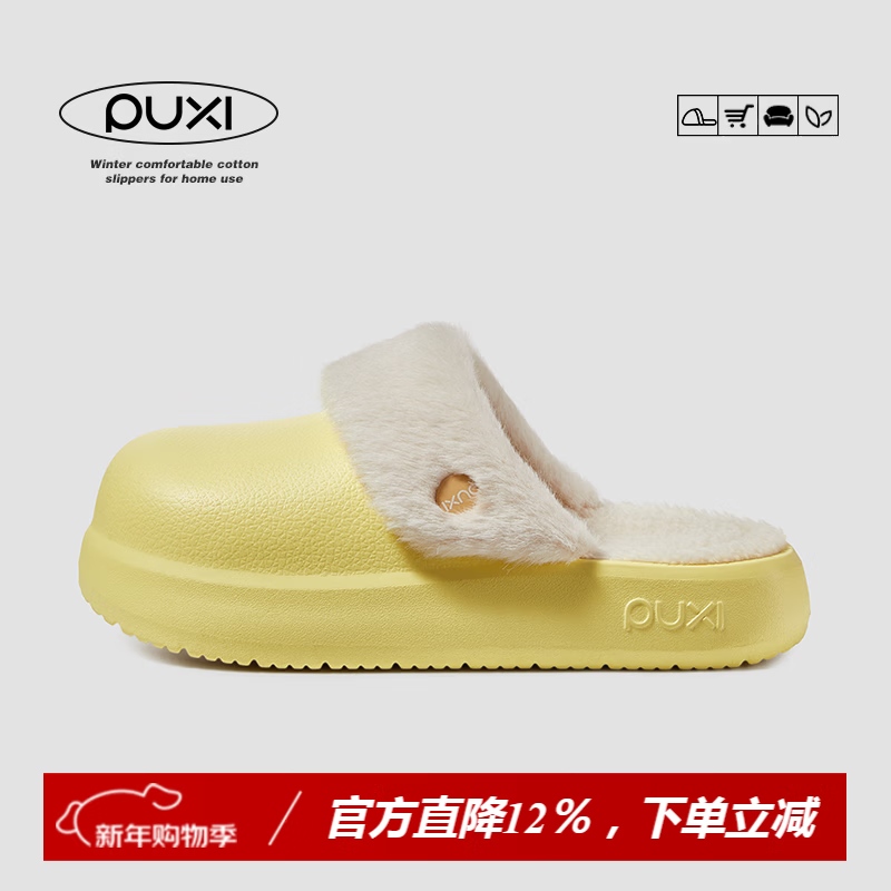 朴西冬季防水棉拖鞋女加绒保暖室内家居可拆卸厚底防滑情侣棉拖男 香蕉黄 【可机洗内胆】 38-39 (适合3738)