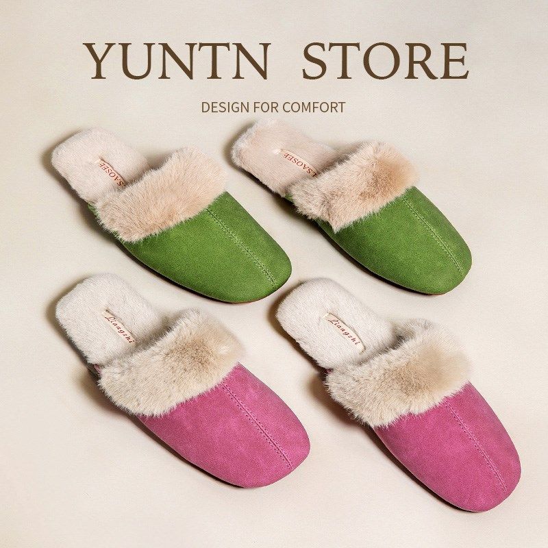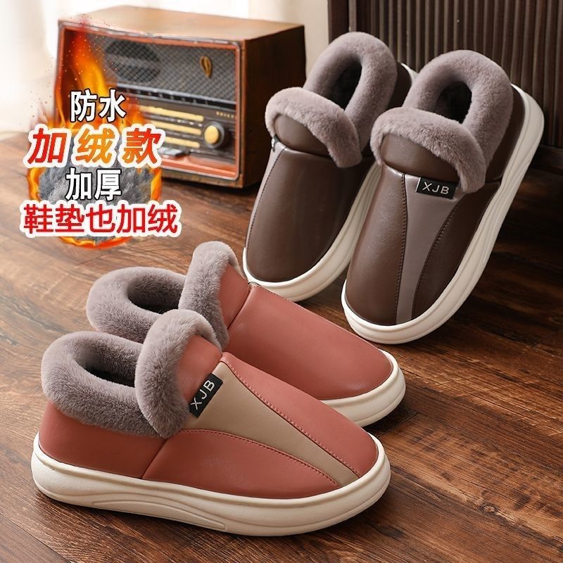 秋冬季温柔气质毛口高级感防水PU皮棉拖鞋女牛筋底室内防滑保暖男