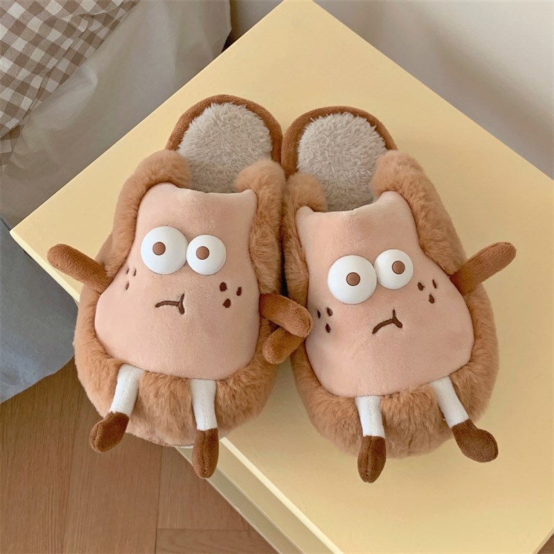 速发 趣味大眼吐司情侣棉拖鞋冬季男家用舒适防滑包头毛毛鞋