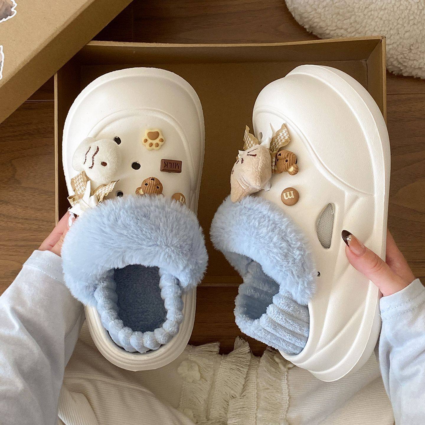 情侣可爱熊棉拖鞋女冬季室内外穿居家防滑加绒厚底毛绒保暖棉拖男