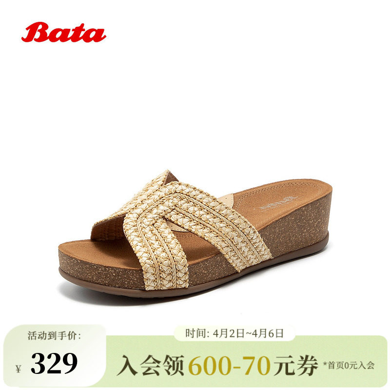Bata无尽假日新款波西米亚风度假软底编织女凉拖鞋AYX37BT5