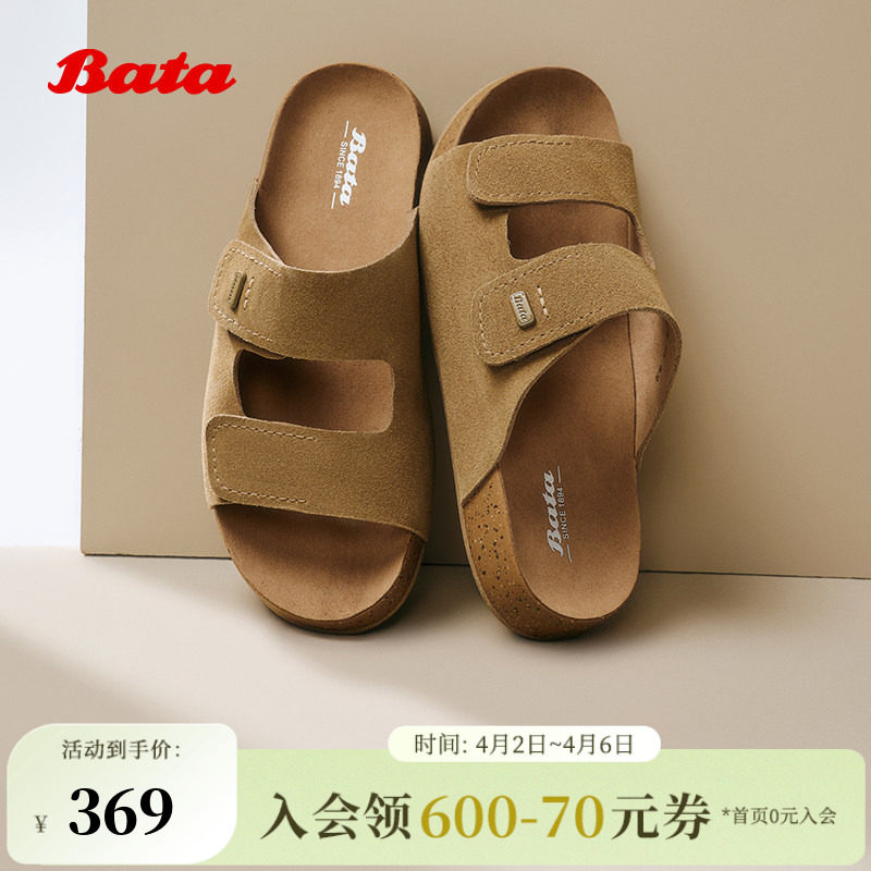 Bata勃肯拖鞋女商场新款英伦风牛剖皮外穿凉拖鞋AUH10BT5