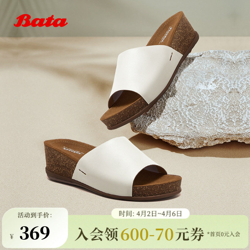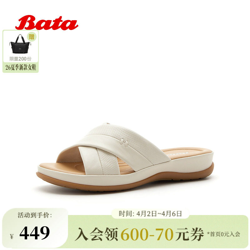 Bata一字拖女2026夏季新款时尚压花厚底居家外穿羊皮拖鞋AVX13BT6