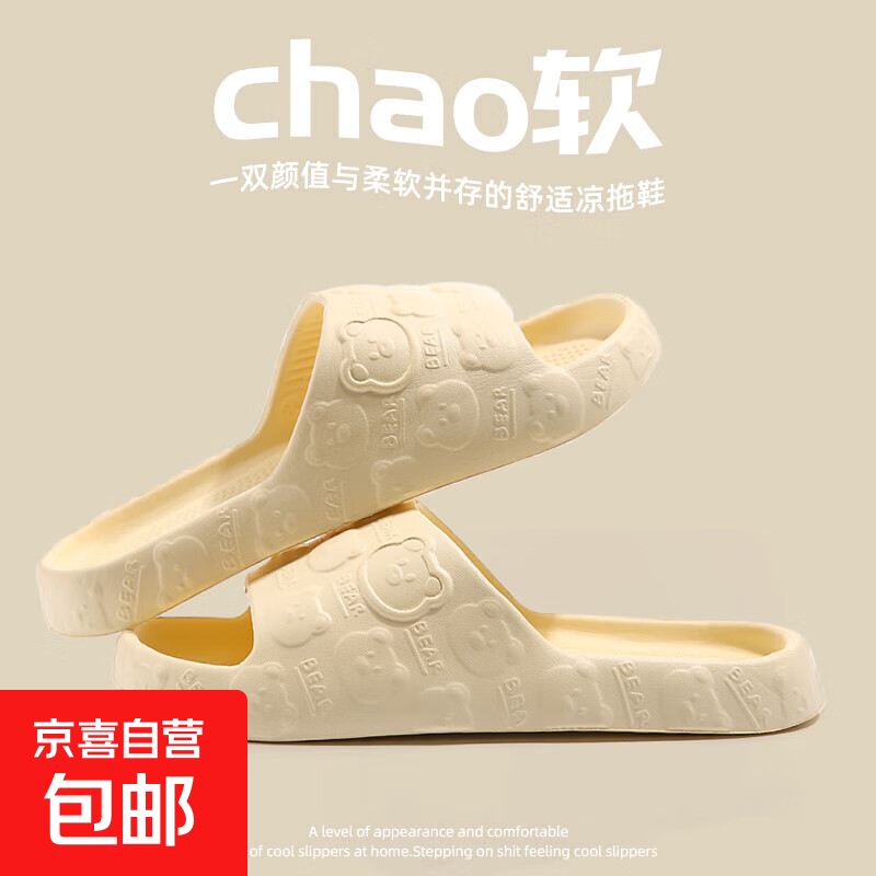 室内家居防滑拖鞋女夏季防臭居家用客厅客拖软底厚底EVA凉拖鞋男 黄色【印花小熊】 38-39