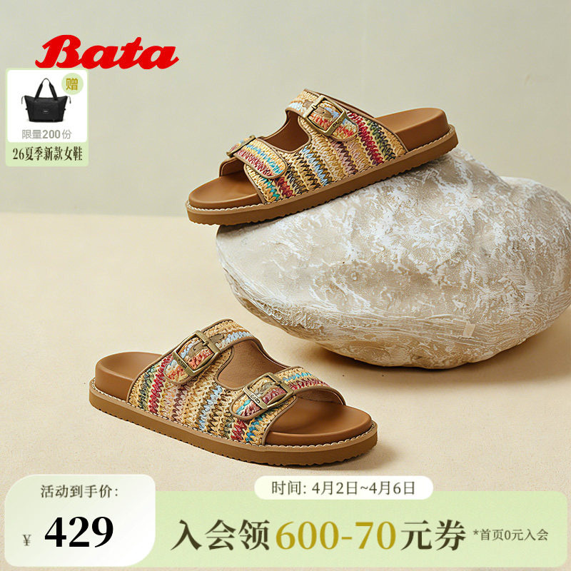 Bata海岛彩虹编织一字拖女2026夏季新款度假时尚休闲拖鞋57836BT6
