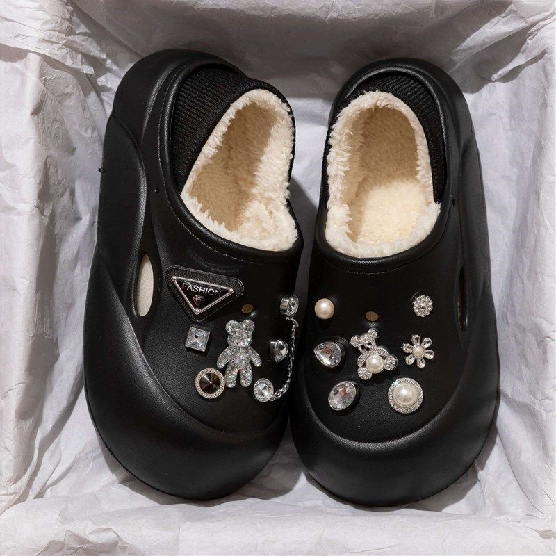 今年流行爆款拖鞋洞洞鞋女加绒加厚外穿冬厚底增高包头保暖棉拖鞋
