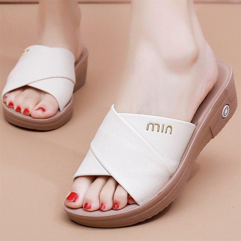 2025新款中年妈m妈拖鞋外穿夏季平底防滑一字拖女士皮面休闲凉拖