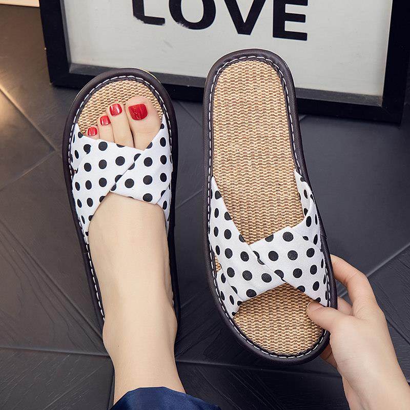 居家圆点布艺透气亚麻凉拖鞋女室内家用防滑地板吸汗棉麻拖鞋四季