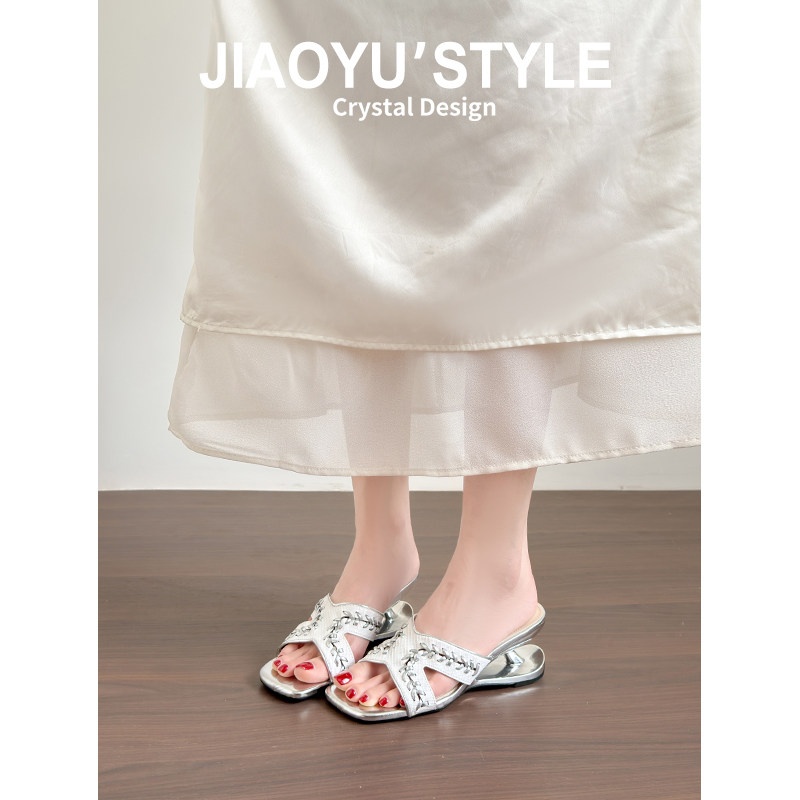 真皮~骄屿坡跟编织露趾拖鞋女夏外穿新款法式一字拖鞋方头凉拖鞋