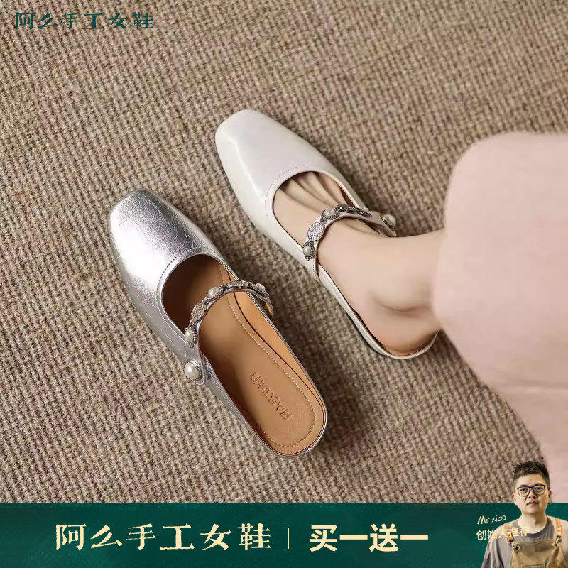 阿么手工女鞋气质银色包头半拖鞋女夏季优雅好看一字带穆勒凉鞋女