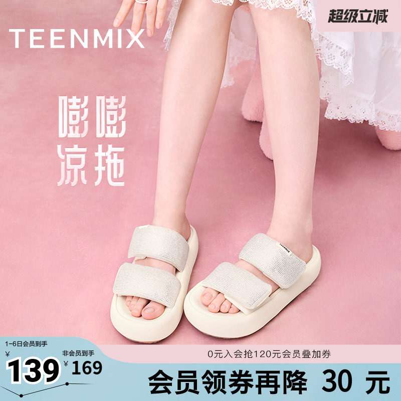 天美意嘭嘭凉拖闪钻一字拖厚底拖鞋女外穿凉拖休闲凉鞋新款