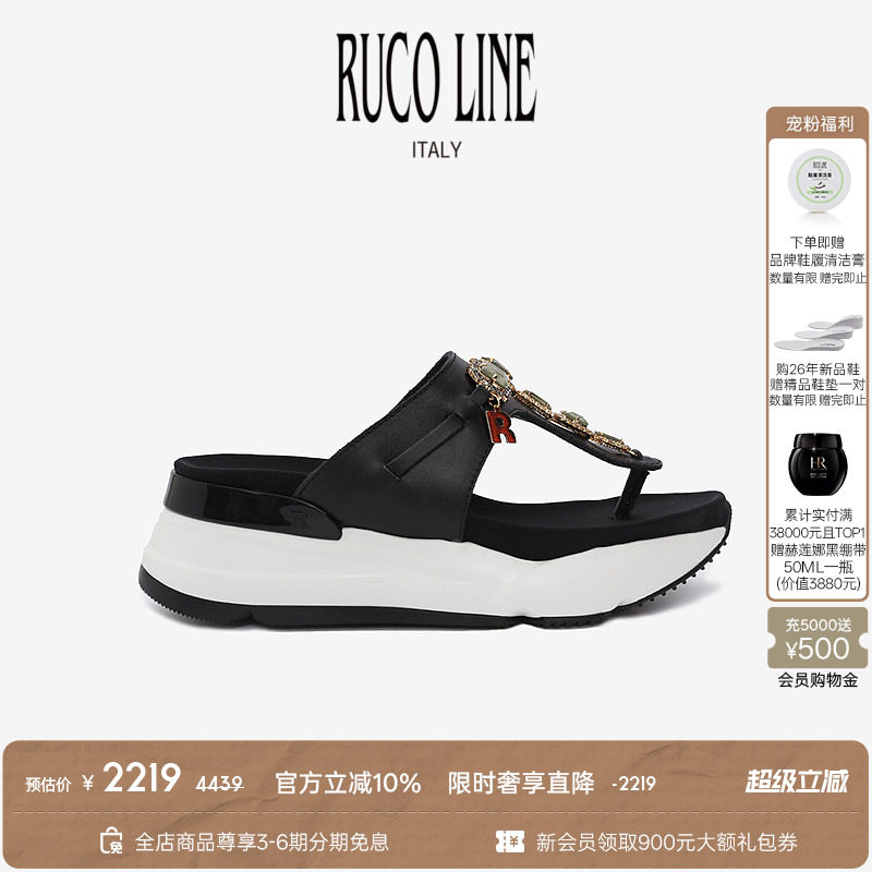 Ruco Line如卡莱奢华牛皮凉鞋厚底水钻人字拖女夹脚拖鞋6cm增高鞋